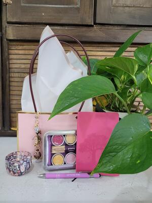 This perfect purse is the gift with the most. It includes: A green plant A purse key finder A candle A journal and pen and A seed packet All in a perfect unique paper tote. Appr. 9"L x 4"D x 13"H