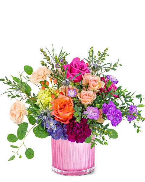 Prismatic in Pink is a wonderful birthday or Mother's Day Gift. Let us help make their day with this special flower design! If you want us to deliver flowers, but want something extraordinary, we suggest Prismatic in Pink. It features beautiful blooms and premium foliage designed in a modern and chic pink vase that will add a pop of color to any space.