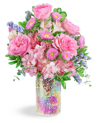 Send your love with this beautiful design, perfect for a birthday, new baby, or romantic gift. Head in the Shimmering Clouds features pink roses, Alstroemeria, and Hydrangea designed in a keepsake vase for a delicate look that will make anyone smile. This unique flower design adds the perfect extra pop of pastel color! We can offer same-day flower delivery in most cases. If you are sending the bouquet directly to your recipient, please provide the complete address and contact information so that we can deliver the flowers directly to them.