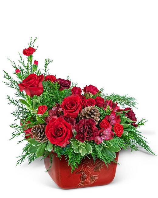 Bring the warm and cozy holiday spirit into your home with our exquisite Ruby Rose Cardinal Stoneware Keepsake. Designed to create an inviting atmosphere, this beautiful centerpiece showcases a mix of hydrangea, roses, spray roses, carnations, alstroemeria, and evergreen foliage, all carefully arranged in a hand-painted stoneware serving bowl adorned with a Cardinal. Pinecones add a touch of natural beauty, infusing your holiday table with a festive and welcoming vibe.