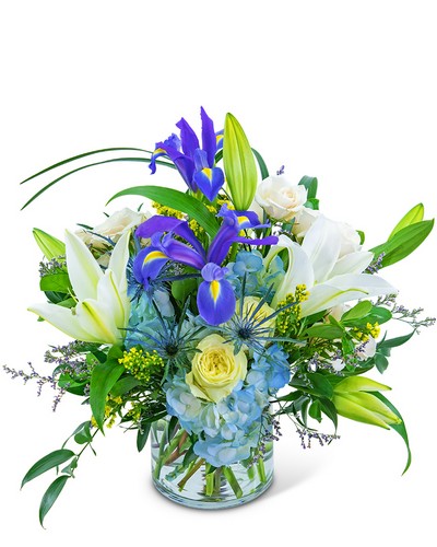 The natural beauty of these blue and white flowers speak for themselves. Untamed Beauty features blue hydrangea, white oriental lilies, blue eryngium, white roses, iris, lily grass, solidago, limonium, and Italian ruscus. This stunning arrangement is perfect for a birthday or anniversary and will add a touch of beauty to any room.
