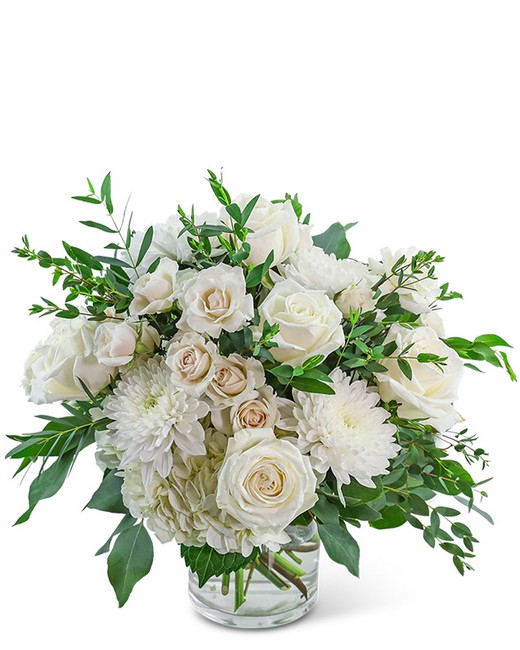 Blushing Symphony is an exquisite floral arrangement featuring roses, hydrangea, Cremons, and premium foliage in a clear glass vase. As your local florist offering reliable flower delivery, this arrangement of white and green flowers is the perfect gift to commemorate a birthday or anniversary, exuding beauty and sophistication.