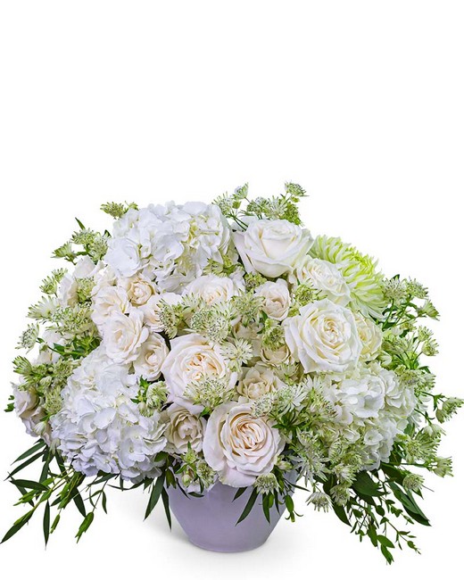 Repose Among Roses is an elegant all-white arrangement featuring premium Roses, Hydrangea, and other accent flowers and premium foliage. Designed in a white ceramic vase, it's an ideal choice for sympathy, anniversaries, or a graceful thank you gift. Our floral designer may make thoughtful substitutions while maintaining the overall look of the arrangement.