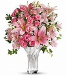 Make Mom blush with joy! This exquisite bouquet includes sweet shades of pink, hand-arranged in a Celebrate Mom glass vase. Approx. 15 W x 17 1/2 H