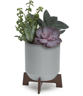 Plant a kiss this holiday with this living gift of sculptural succulent plants in a modern ceramic planter with cool wooden base.
