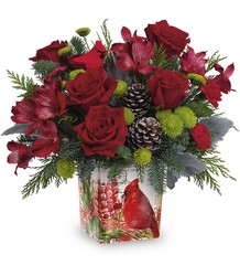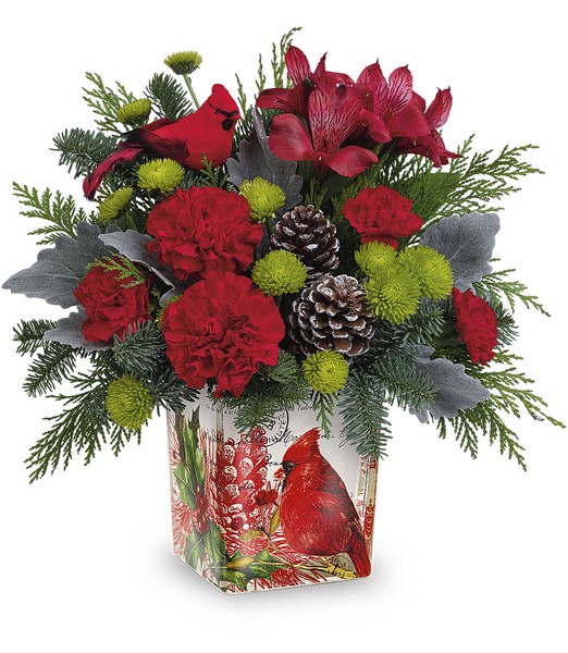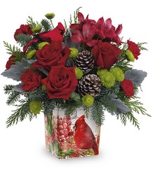 This Christmas cardinal delivers your best wishes for a joyful holiday season with stunning crimson blooms and fresh-from-the-forest greens. The vintage-inspired cube vase doubles as a candleholder!