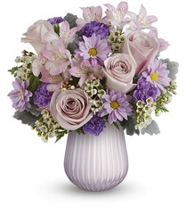 Lavender love! This modern, monochromatic bouquet of pale pinks and lustrous lavenders looks super chic in a sculpted glass vase with contemporary opaque finish.