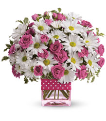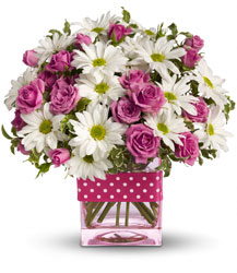 Polka dots and posies, they're the perfect pair. Well, at least in this pretty arrangement they are. Just the right flowers in just the right vase all wrapped up in... you guessed it, just the right ribbon.