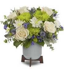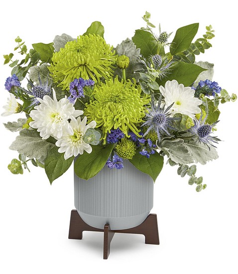Bold green blooms are contrasted by the modern lines of this chic contemporary planter with wooden base.