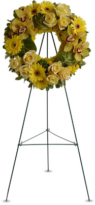 This sunny yellow wreath of Circle of Sunshine flowers will bring golden memories of a much-loved spirit to a wake, memorial or funeral service.