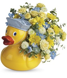 A new baby has joined the flock! Congratulate the lucky parents with this delightfully ducky gift of radiant roses and mums in a sweet ceramic duck keepsake with a matching sailor's cap.